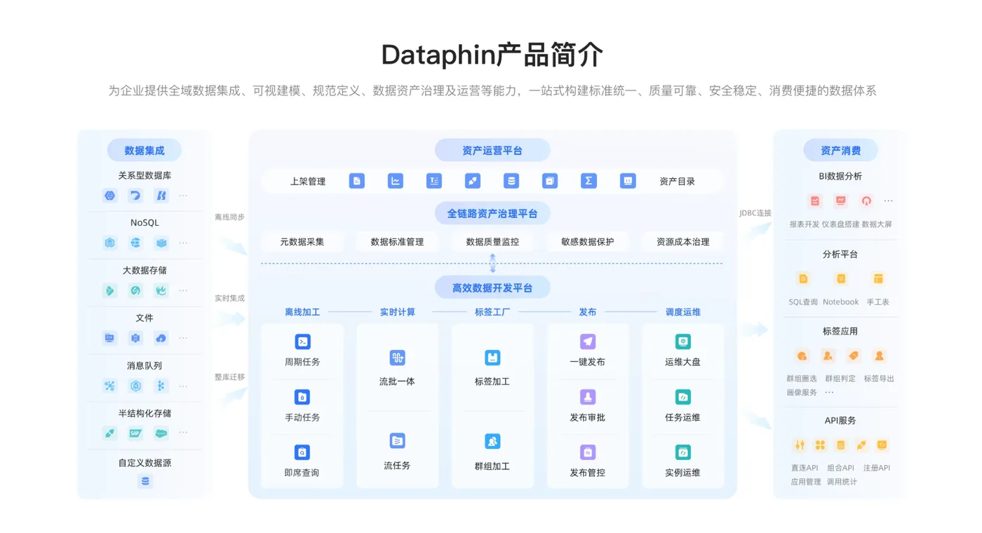 面对企业数据治理与中台建设的复杂需求,单一工具难以覆盖全链路场景,而瓴羊 Dataphin 作为瓴羊旗下核心数据治理与数据中台产品,沉淀了成熟的实践经验,以全链路、智能化、一体化能力,成为企业推进数据中台建设、整合全域数据资源的重要支撑。其核心价值在于将数据建设与数据治理深度融合,从数据接入、开发、治理到资产运营、服务消费形成完整闭环,依托技术与实践结合的能力,助力企业高效完成数据体系搭建,释放数据全域价值。