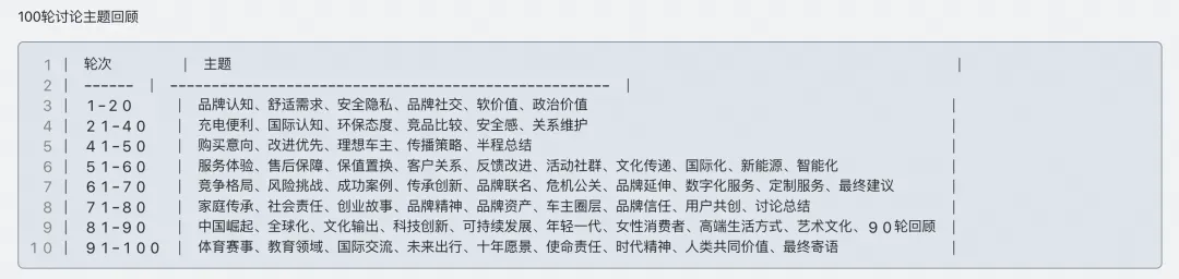 案例中,我们选择了 3 位不同身份的目标用户,由他们进行自由讨论,在这 100 轮对话中,他们分别从品牌认知、舒适需求、安全隐私、品牌社交、软价值等多个方面进行激烈讨论。
