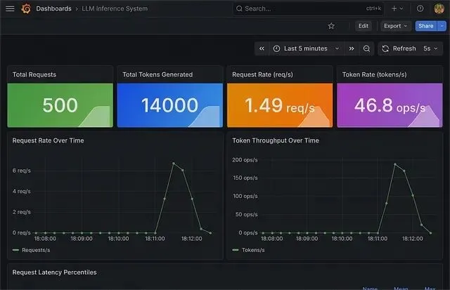 Grafana 在首次启动时通过 Docker Compose 自动配置,自带 p50/p95 延迟、吞吐量和 token 速率的实时面板。一条命令拉起整个栈: