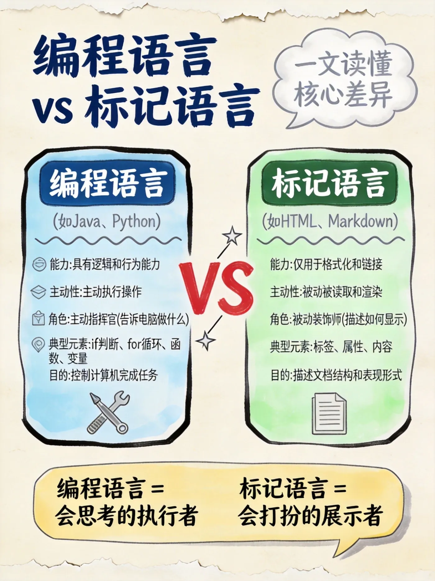 我们可以这样理解:编程语言是“指挥官”,标记语言是“装饰师”。