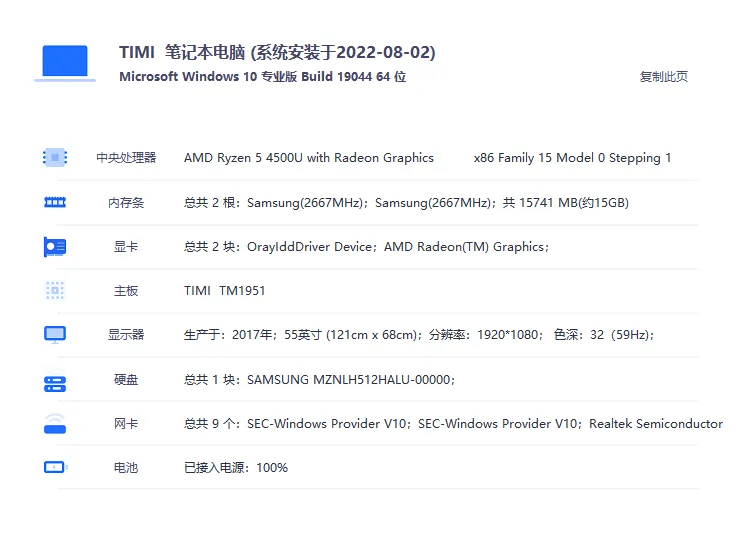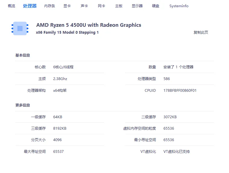 比如说我们查看处理器信息时,可以看到,很多的信息能更具体的展示出来,通过右上角的复制此页也可以把内容复制下来。