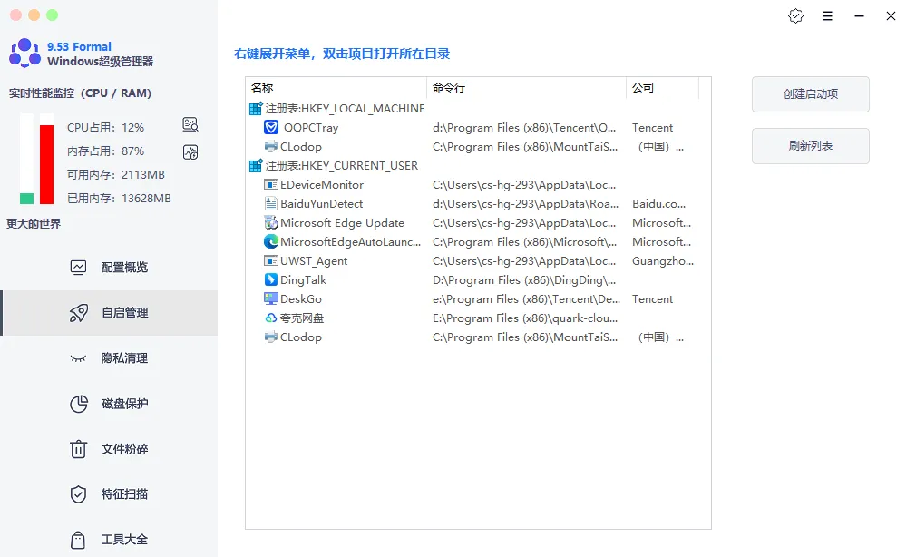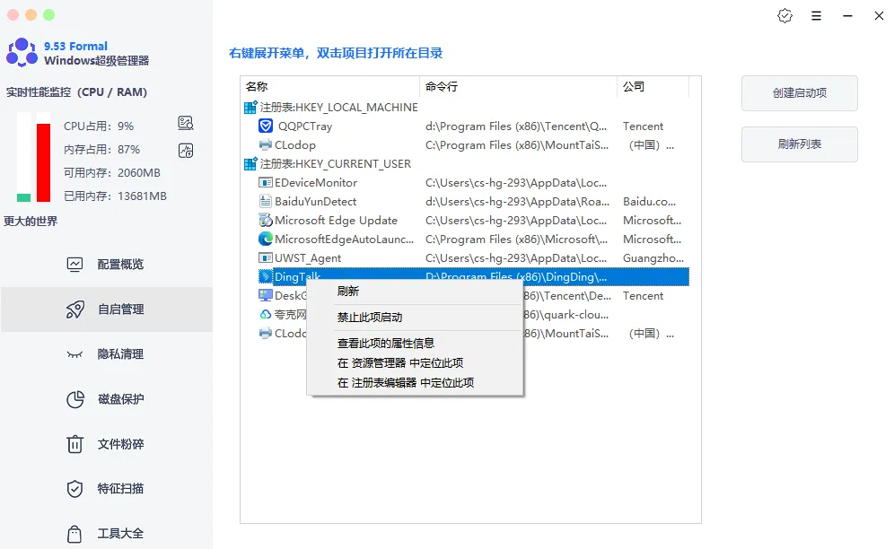 操作也比较简单,直接点击右键选择要禁止启动的软件就行,同样的,通过右键也可以添加相关的软件启动。