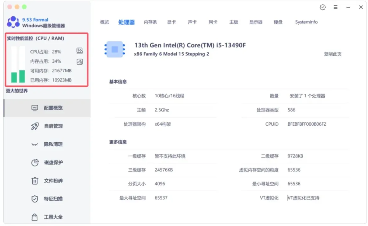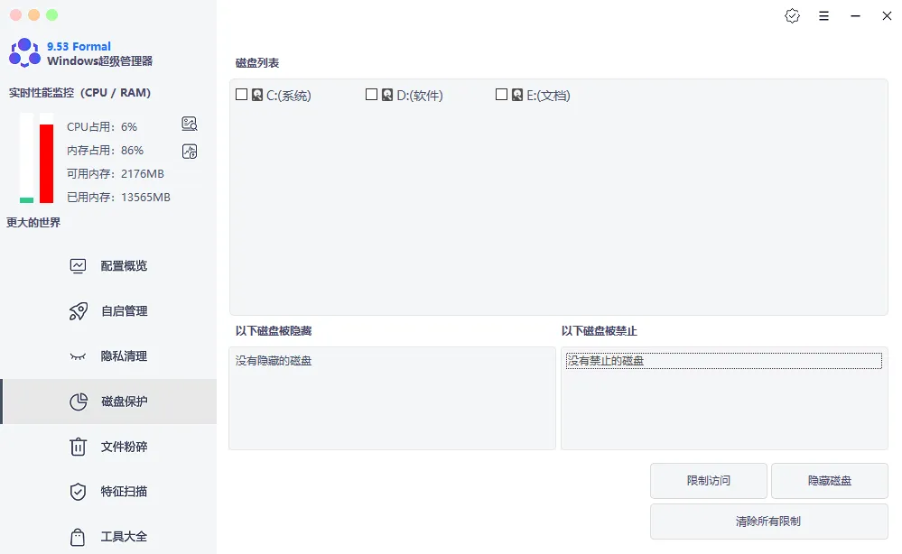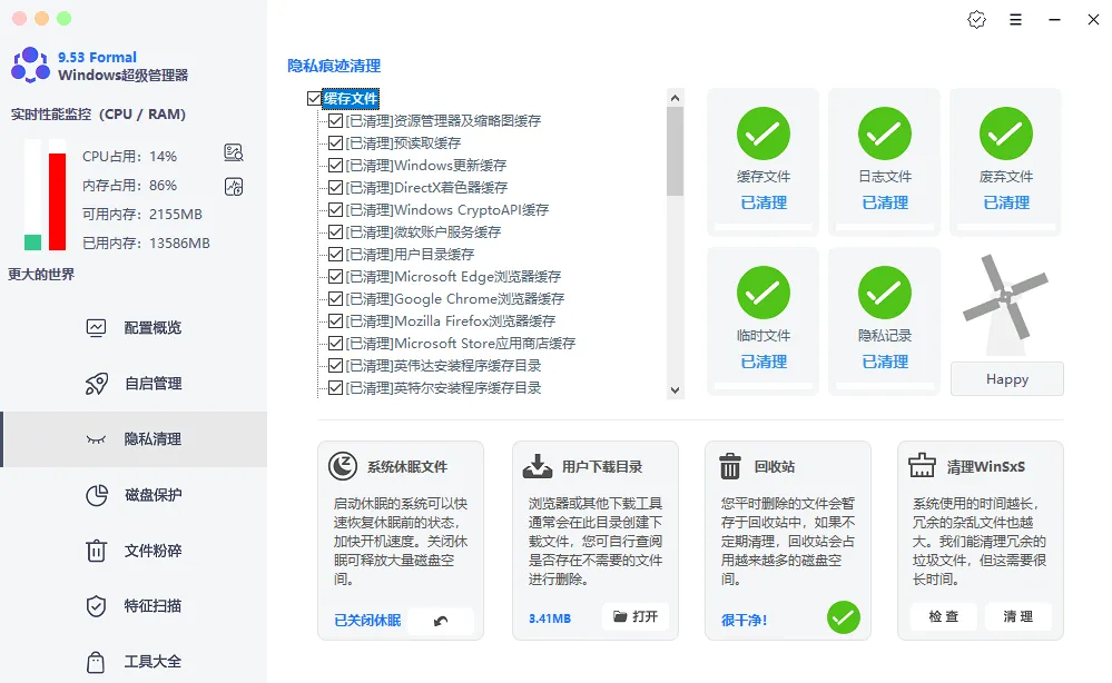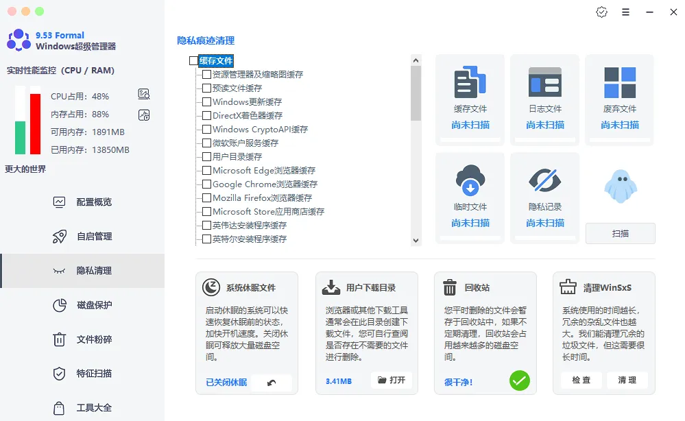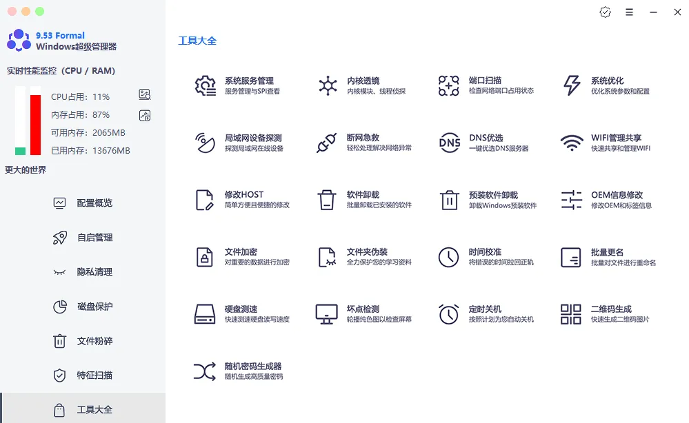 主要的功能点为系统检测、性能优化、隐私保护、安全管理:可实时监控CPU、内存,一键查看硬件配置;管理开机自启项、清理垃圾与注册表、优化系统;支持隐私痕迹清理、磁盘隐藏/访问限制、文件彻底粉碎;内置断网急救、DNS优选、批量重命名、文件夹伪装等20+实用工具。