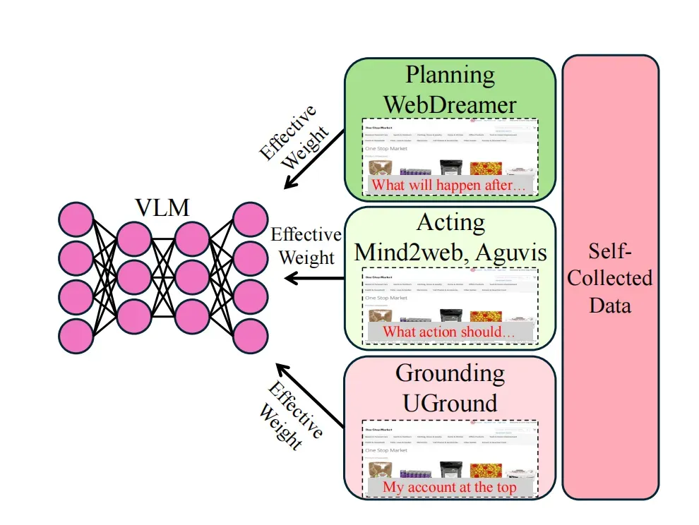围绕这三类能力,OpAgent 整合了 Mind2Web、Aguvis、UGround 等数据集,并设计了基于有效样本数的任务加权策略,解决不同任务数据规模不平衡的问题,避免模型被“大数据集任务”主导。