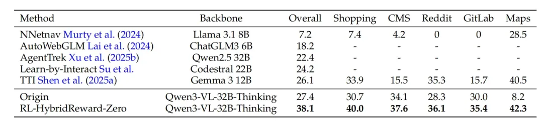在 WebArena 基准测试中,经过在线 RL 优化的单模型(Qwen3-VL-32B-Thinking + RL-HybridReward-Zero)取得了 38.1% 的成功率(Pass@5),显著优于 27.4% 的原始基线。