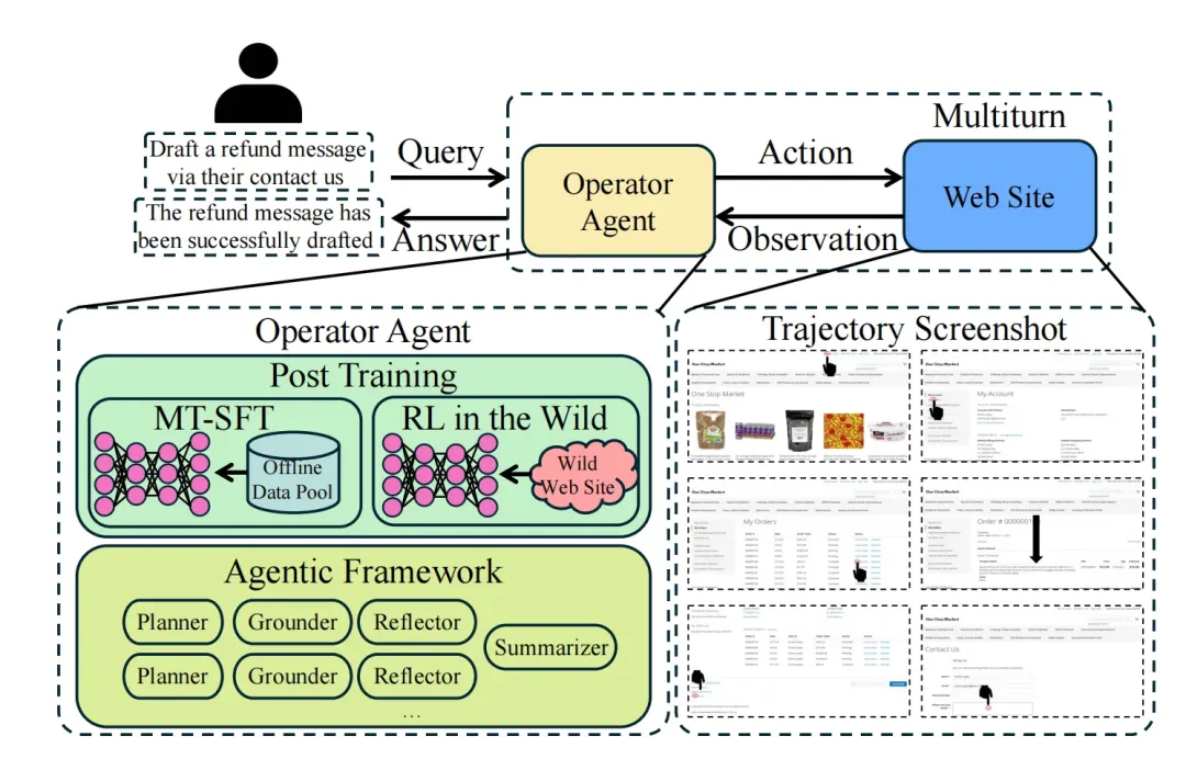 为了应对网页环境的动态性(如页面刷新、隐藏逻辑等),OpAgent 搭建了一套面向 Web Agent 的在线交互基础设施,让模型能够在真实网站和 WebArena 环境中大规模执行任务、采样轨迹并持续优化。