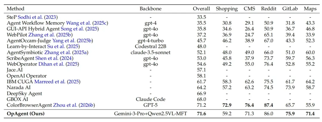OpAgent 在权威 Web 智能体评测基准 WebArena 上以 71.6% 的任务成功率位列榜首。其核心竞争力源于一套系统性的技术路线: