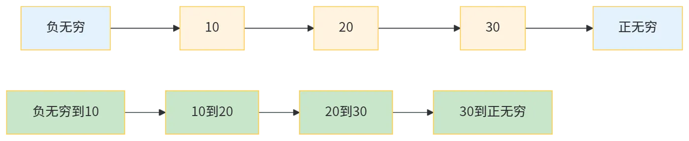 InnoDB会将索引按照值排序,划分成多个左开右闭的区间,例如索引列有值10、20、30,会划分出4个临键区间:(-∞,10](10,20](20,30](30,+∞)
