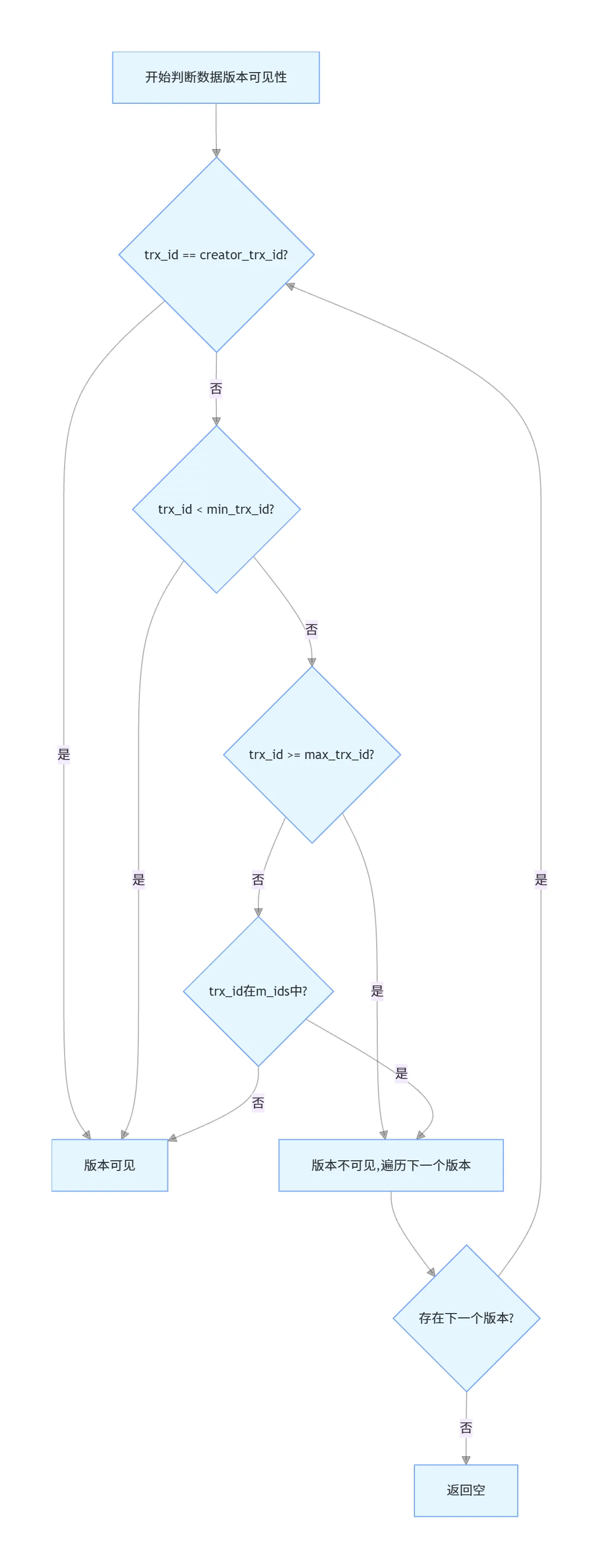 4. min_trx_id <= trx_id < max_trx_id:若trx_id不在m_ids中,可见(事务已提交);若在m_ids中,不可见(事务未提交)。