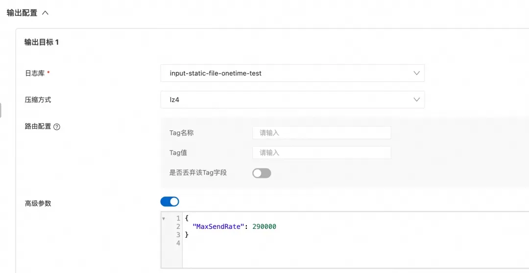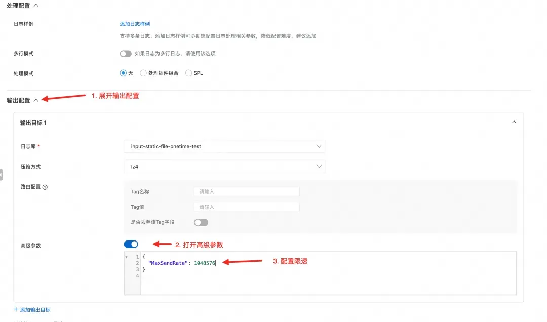 • 发送限流(flusher_sls.MaxSendRate):可通过 SLS 输出的高级参数 MaxSendRate 做发送速率限制,单位为 B/s。当 MaxSendRate > 0 时,发送队列会启用 rate limiter,从而降低对网络带宽、SLS 写入配额的冲击。