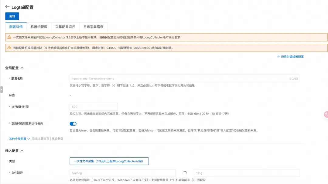 一次性文件采集适合历史数据迁移、断网补采、临时批处理等场景——配置下发后按“启动时刻文件快照”执行,配合 checkpoint 保障可恢复、可观测,再结合 ExcutionTimeoutMaxSendRate 做好“时长 + 流量”双重兜底,就能在不扰动线上持续采集的前提下,把静态数据稳稳补齐。欢迎大家试用和反馈!