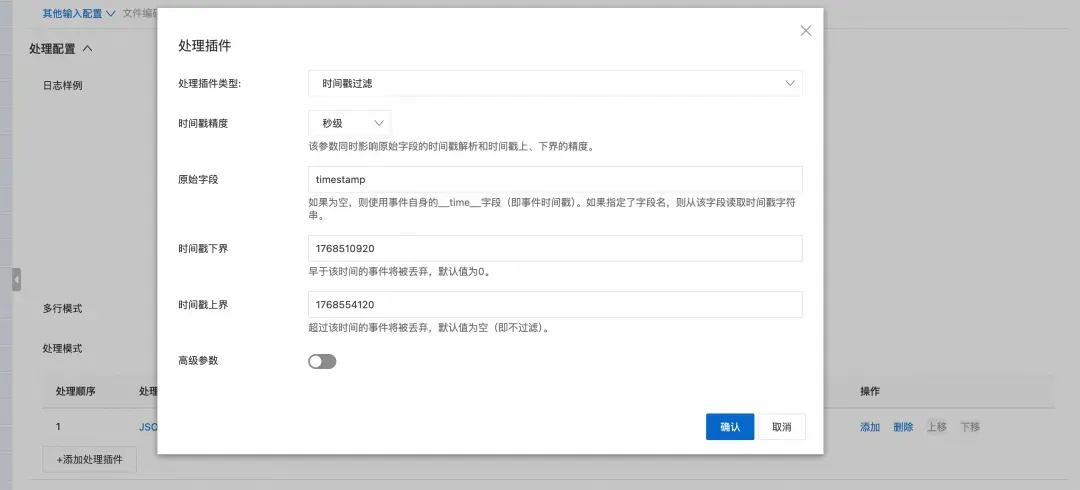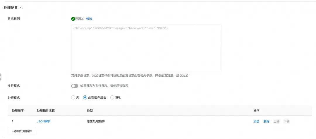 3. 填写文件采集配置(与普通文件采集的配置习惯一致),按需配置处理插件后保存。 更详细的说明和参数解释可以参考官网文档:https://help.aliyun.com/zh/sls/one-time-collection-of-host-te...