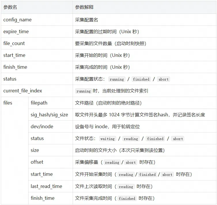 2. 只读取启动时刻的文件大小:每个文件会记录一个 initial size,采集过程中即使文件被追加写入,本次也只读取到 initial size 为止(避免边采边写带来的不可控重复/漏采)。