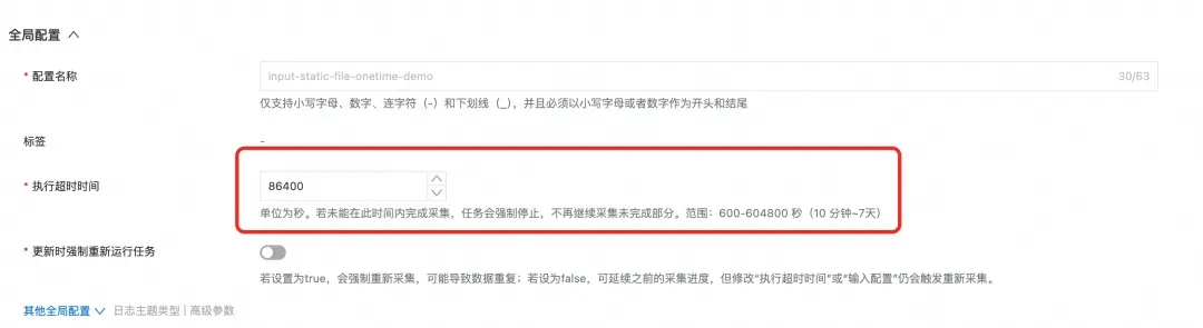• 除了 global.ExcutionTimeout,inputs 插件也需要是一次性的输入插件(通常为 _onetime 结尾),否则配置也无法生效。本文中,我们使用 input_static_file_onetime 插件来执行“一次性文件采集”。