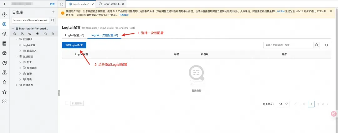 1. 登录 SLS 控制台,在 Logtail 配置页面选择“一次性配置”,点击“添加 Logtail 配置”。