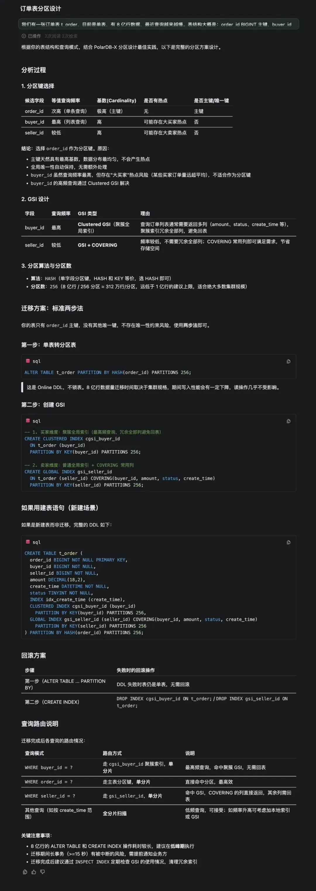 大模型能写代码、能做翻译,但面对数据库分区设计这种强领域知识 + 强上下文依赖的任务,通用大模型往往无法给出可靠的方案——它不了解 PolarDB-X 的分区算法细节,不知道 Clustered GSI 和普通 GSI 的取舍逻辑,更不清楚你的查询模式应该怎么匹配分区策略。