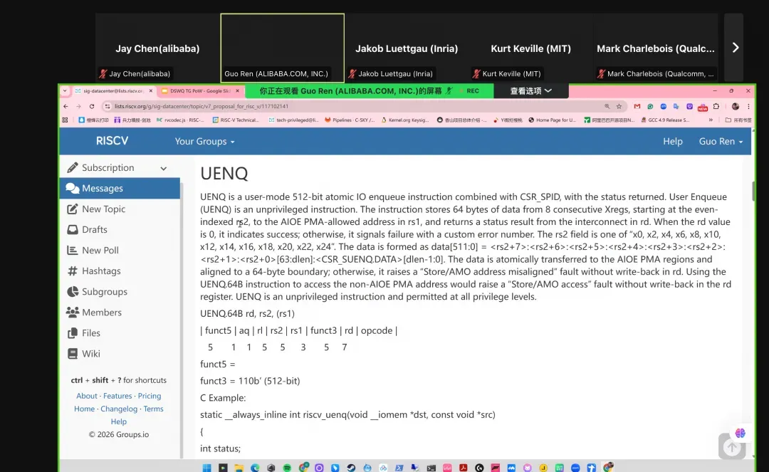 RISC-V International Data Center SIG 近期召开线上双周例会,本次会议在完成例行的社区协作、反垄断与出口管制等合规提示后,进入技术讨论环节:与会者集中评审 Atomic I/O Enqueue(AIOE / Atomic IONQ)扩展提案 v4。来自 Inria、Qualcomm、阿里巴巴等机构的代表参会并确认讨论细节。