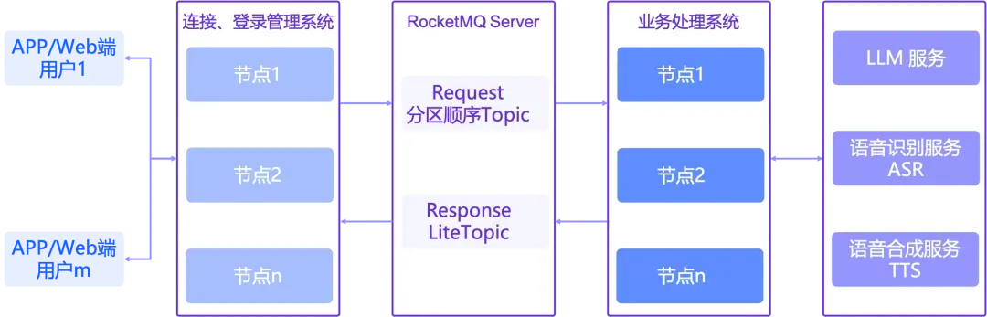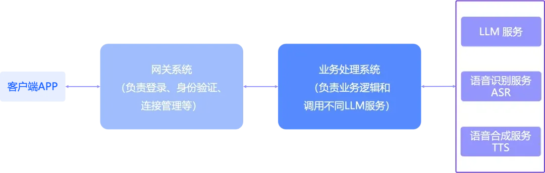 语音交互的消息流转路径通常贯穿:APP <-> Gateway <-> BizProcessSystem (Route) <-> LLM/ASR/TTS。其中,APP 与 Gateway、BizProcessSystem 与 LLM 之间均维持着 WebSocket 长连接。