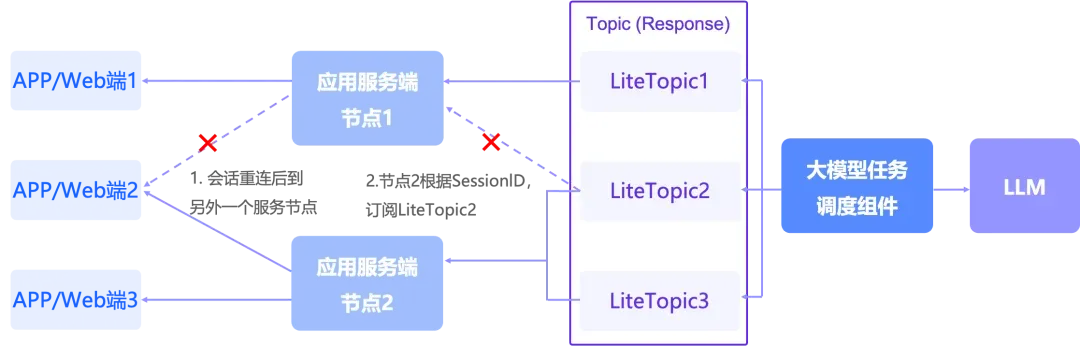 借助 LiteTopic 的自动创建、“一会话一通道” 和动态订阅机制,系统可以为每个语音会话建立独立的响应通道。无论 LLM 推理耗时多久,消息都能在专属通道中有序流转,避免多会话间的消息串扰。