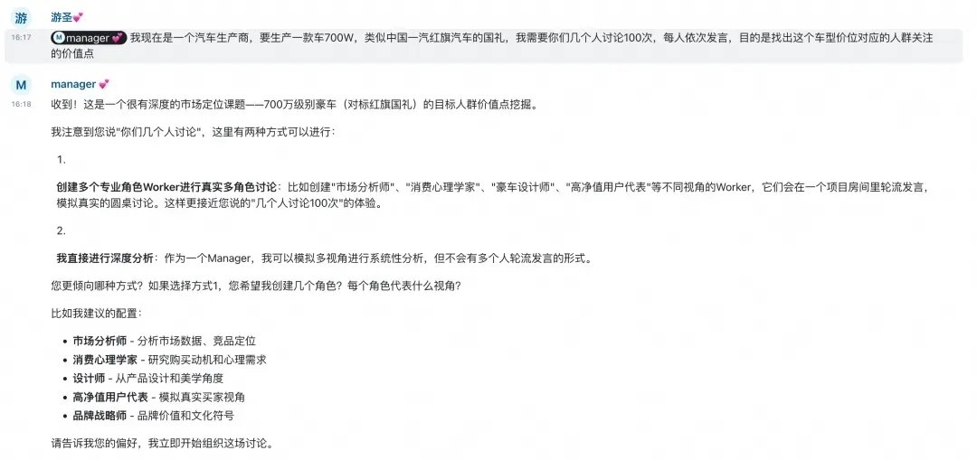 我们来看一个基于 HiClaw 构建的群体智能的实践案例。一家汽车生产商,计划生产一款 700w 的豪车,通过设计 N 个角色,由他们进行 100 次的讨论,给出一个结果。