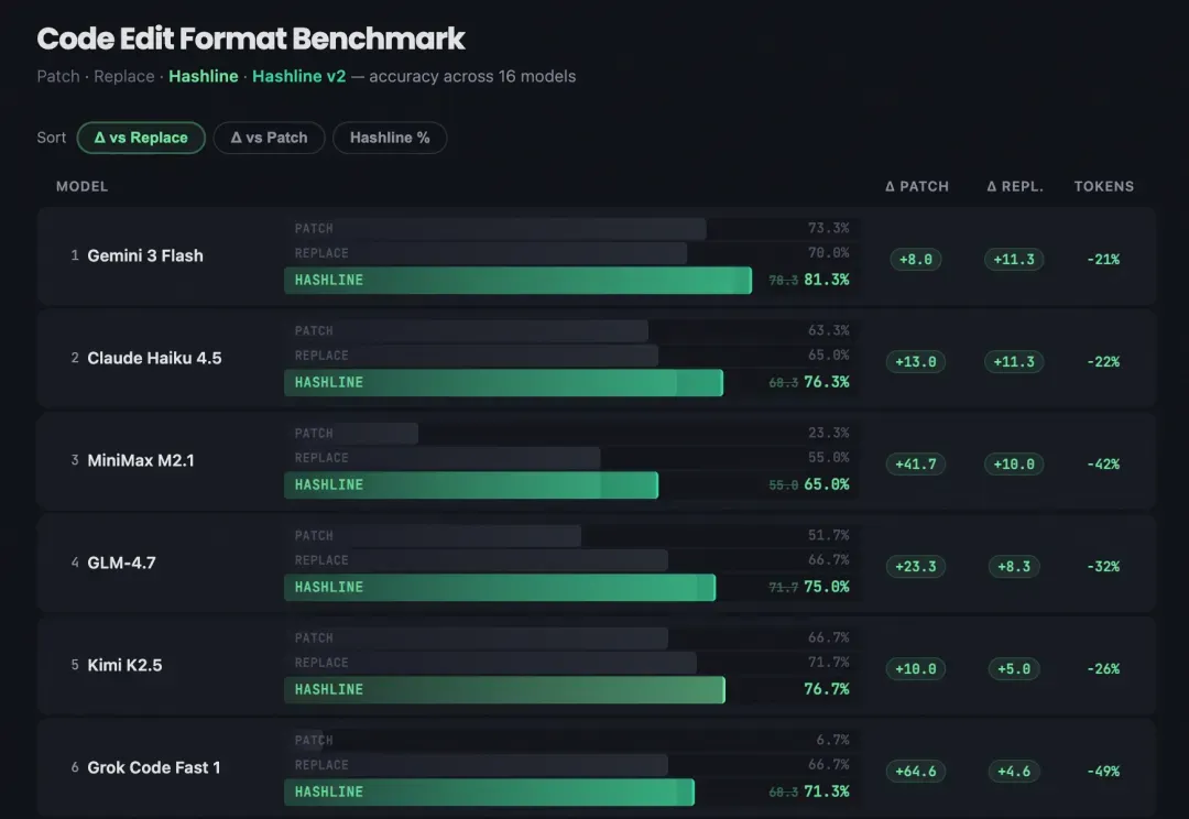 结果:16 个模型、3 种编辑工具、180 个任务、每个任务 3 次运行。Hashline 在几乎所有模型上都匹配或超越了传统方案。最极端的案例是 Grok Code Fast 1,成功率从 6.7% 飙升至 68.3%,十倍提升!Grok 4 Fast 的输出 token 也下降了 61%。