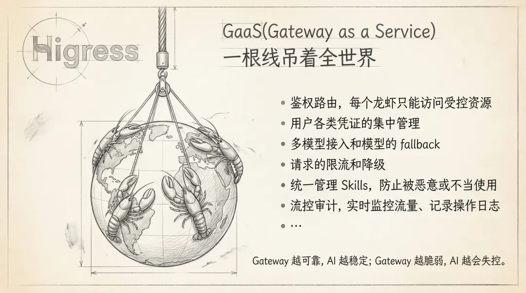 - 引入 Higress AI Gateway:实现鉴权路由(每个龙虾只能访问受控资源),凭证和访问安全(集中管理用户各类凭证、安全护栏),后端稳定(多模型接入和模型 fallback、限流和降级),Skills 统一管理,防止被恶意或不当使用,入口监控(QPS、鉴权失败率、Token 配额消耗、MCP 服务延迟)、安全审计(请求记录、操作日志记录等)。AI Gateway 的重要性见下图。