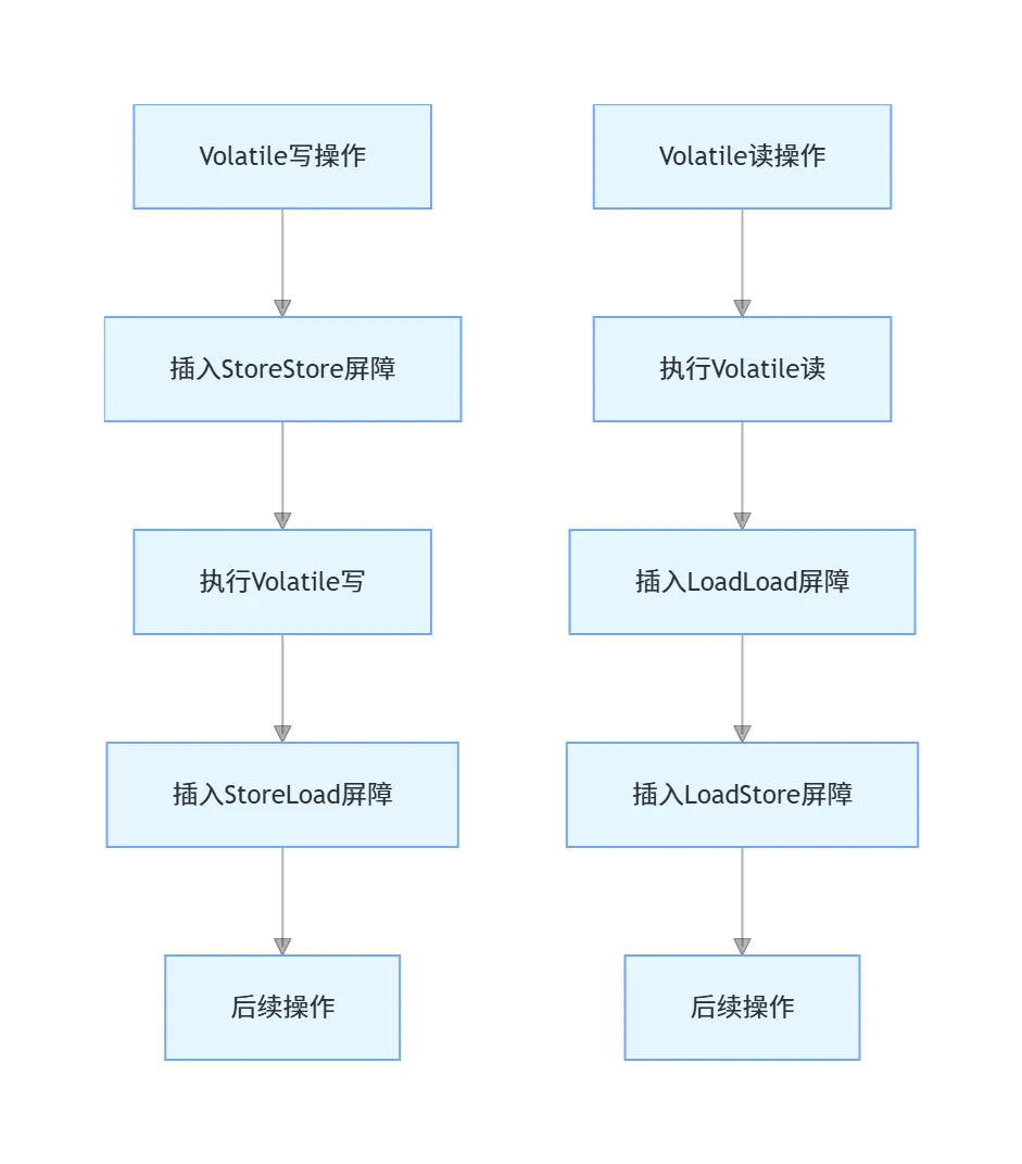 为了实现volatile的可见性和有序性,JMM会在volatile变量的读写操作前后插入内存屏障: