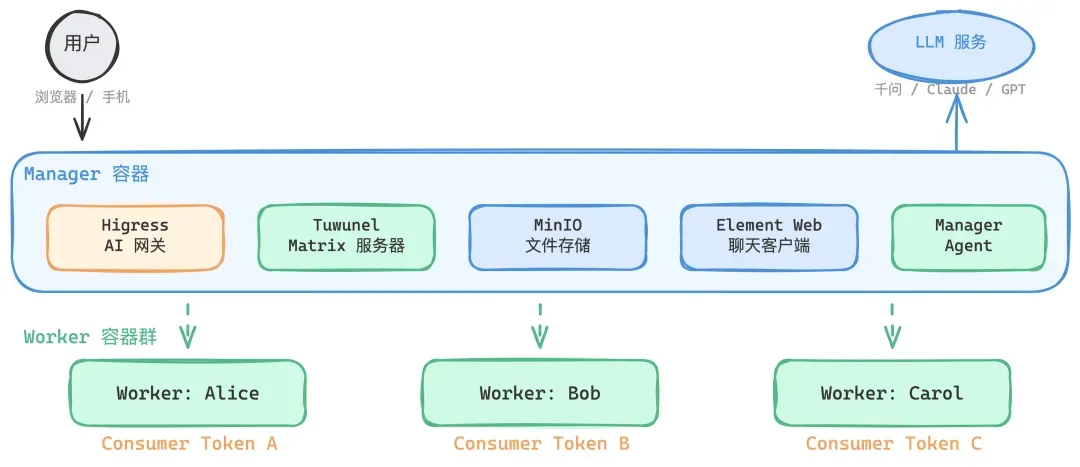 架构分三层。最上面是用户和 LLM 服务。中间是 Manager 容器,包含 Higress AI 网关(流量入口 + 密钥保管)、Tuwunel Matrix 服务器(自建 IM)、MinIO(文件共享)、Element Web(聊天客户端)和 Manager Agent(只管理不执行)。最下面是 Worker 容器群,每个 Worker 独立运行,只持有临时 Token,看不到真实密钥。