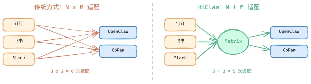HiClaw 在中间加了一层 Matrix 协议,所有渠道桥接到 Matrix,所有运行时只需实现 Matrix 接口。3 个渠道 + 2 个运行时,从 6 次适配降到 5 次,规模越大优势越明显。CoPaw 接入 Matrix 只写了大约 680 行代码,就自动打通了所有消息渠道。
