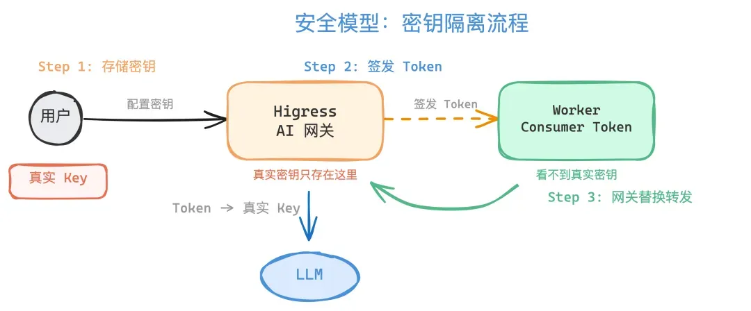 安全模型分三步:真实 Key 只存在 Higress 网关里;网关为每个 Worker 签发 Consumer Token 作为临时通行证;Worker 拿 Token 请求 LLM,网关自动替换成真实密钥再转发。
