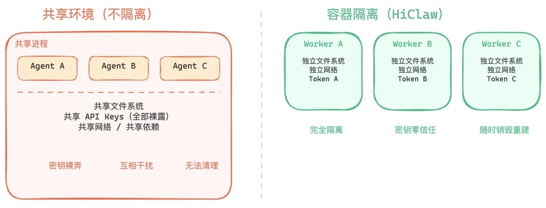 HiClaw 的做法:每个 Worker 一个容器,独立的文件系统、网络、依赖。出了问题直接销毁重建,状态都存在 MinIO 里,不会丢。