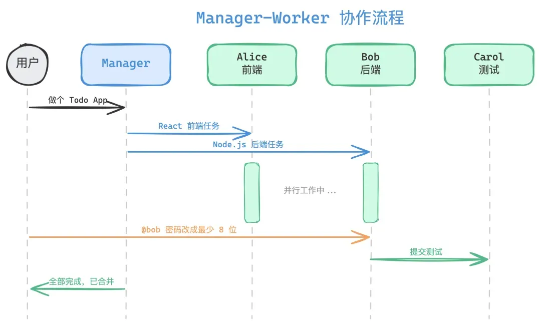 多 Agent 的思路很直接:一个 Manager 负责管理,下面多个 Worker 各司其职。Alice 做前端,Bob 做后端,Carol 做测试,同时开工,互不干扰。每个 Worker 有独立上下文,不会互相污染,而且可以用不同的模型,写代码的用 Opus,查资料的用 Haiku,成本能省 60% 到 80%。