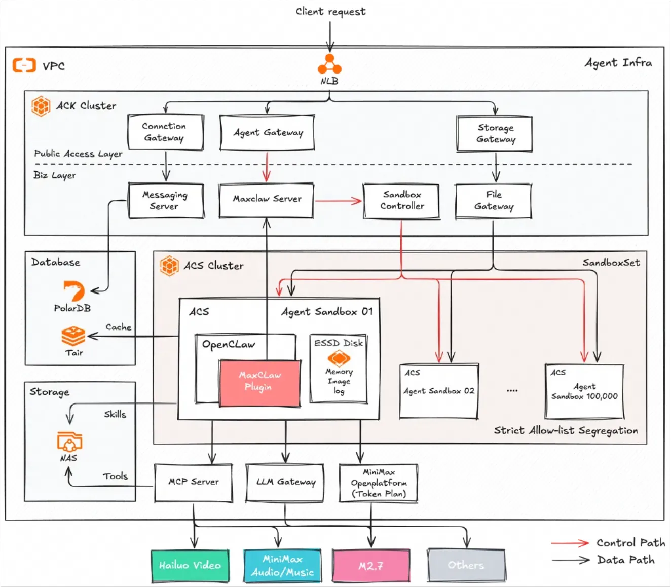 为了解决这一难题,MiniMax 与阿里云展开深度合作。MiniMax 依托于阿里云容器服务 Kubernetes 版(ACK)和容器计算服务(ACS)提供的 ACS Agent Sandbox,为其最新发布的企业级平台 MaxClaw 构建了一套端到端的云原生 Agent 基础设施。