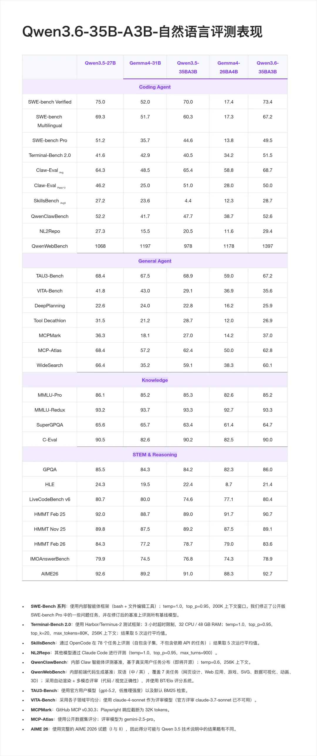 在知识与推理方面,MMLU-Pro 85.2、GPQA 86.0、AIME 2026 全卷 92.7、LiveCodeBench v6 80.4,均与 27B 稠密模型处于同一水平线。