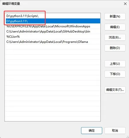 5)点击"新建",手动添加“D:\python3.11\” 和 “D:\python3.11\Scripts\”,将 Python 安装路径修改成自己的,然后单击确定按钮,就完成了对环境变量的设置。