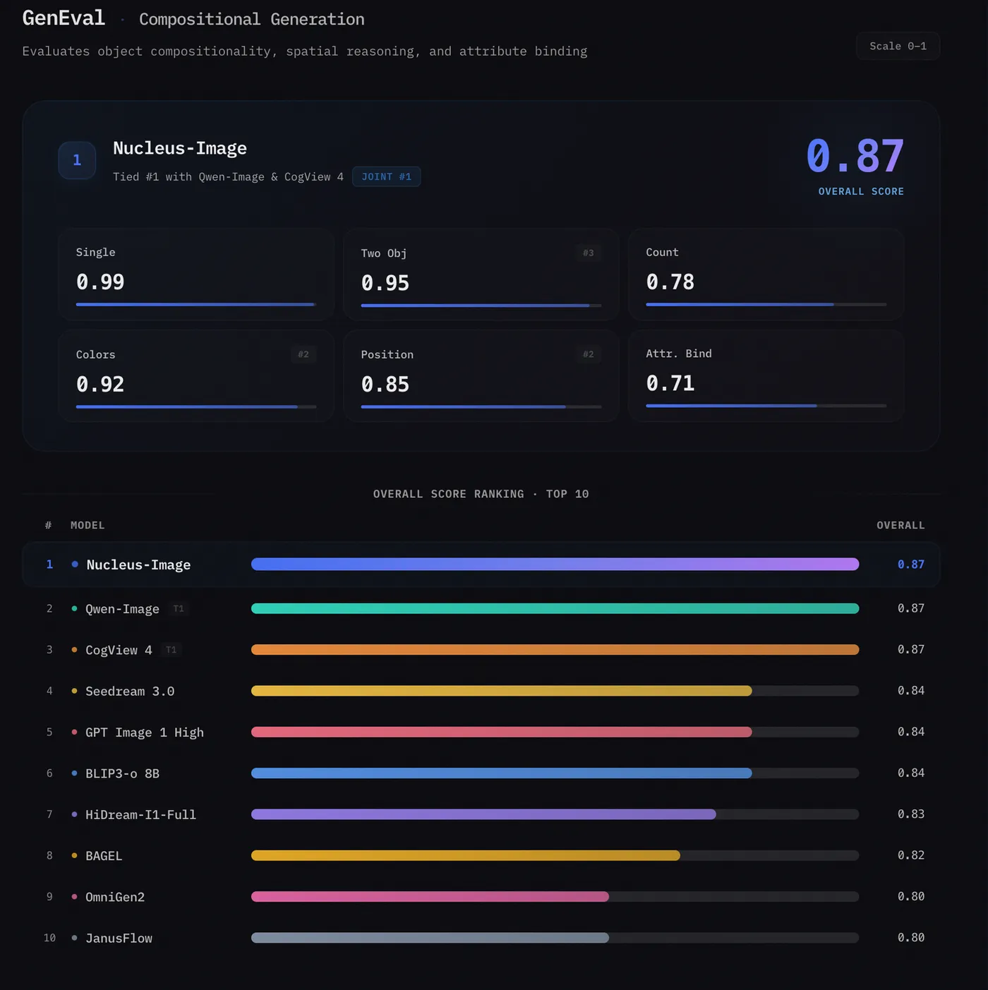 GenEval 组合生成基准 总分0.87,与Qwen-Image和CogView 4并列第一。在6个子项中表现全面:Single 0.99、Two Obj 0.95、Colors 0.92、Position 0.85、Attr. Bind 0.71。其中空间位置子项(0.85)尤为突出,SD3.5 Large和FLUX.1 Dev在该项上分别仅得0.34和0.22,空间布局理解正是MoE专家特化特别擅长捕获的能力。