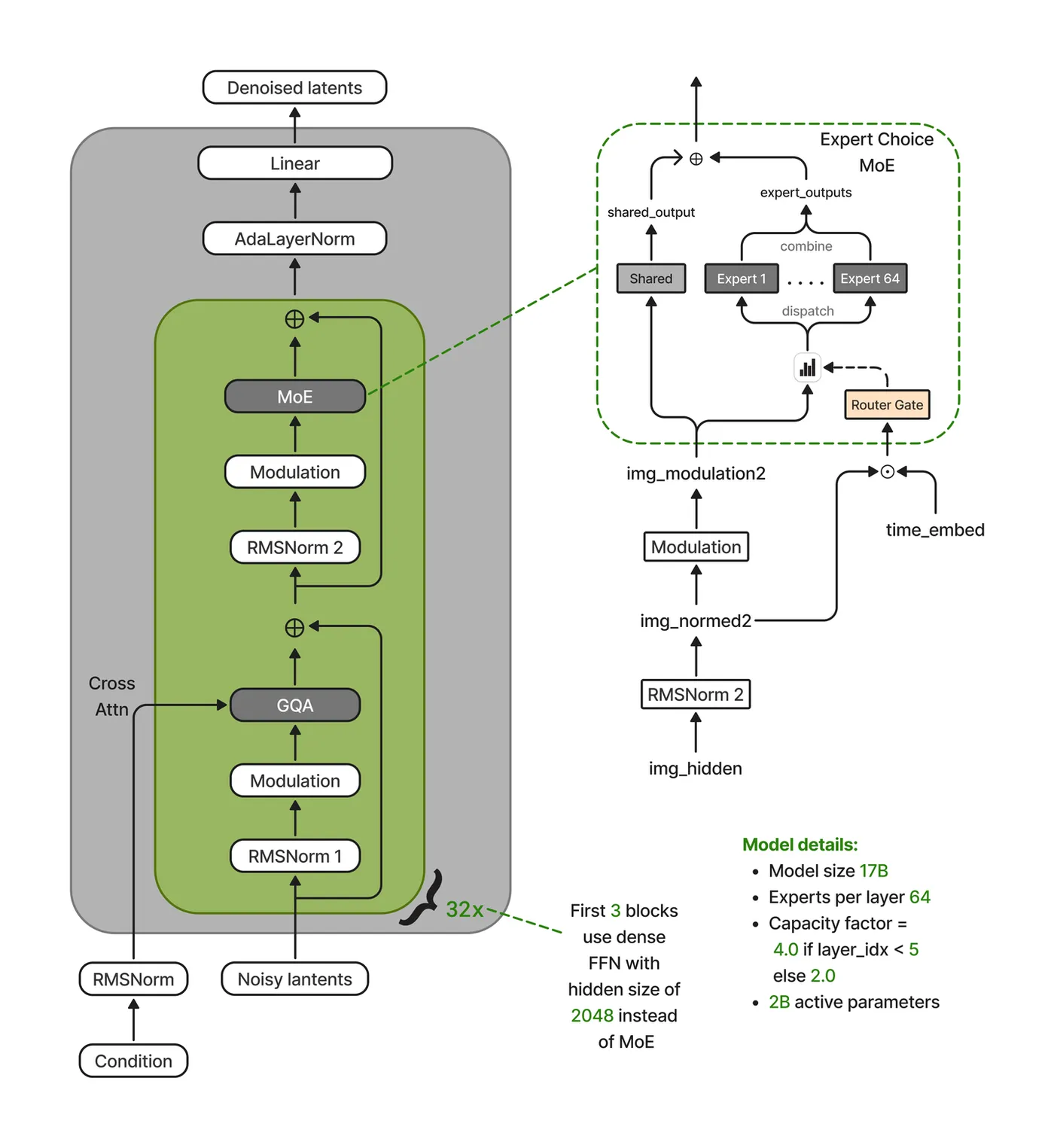 DiT的自适应调制使不同时间步下表示范数相差一个数量级,直接复用LLM式路由会导致logits被时间步尺度主导,专家特化丧失。Nucleus-Image将路由与计算解耦:路由器接收 [x_norm ‖ t_emb](内容决定路由,时间步为加性通道),专家接收完全调制后的 x_mod 保持条件表达能力。解耦路由下专家按空间和语义身份清晰特化,耦合路由则训练不稳定且专家同质化。