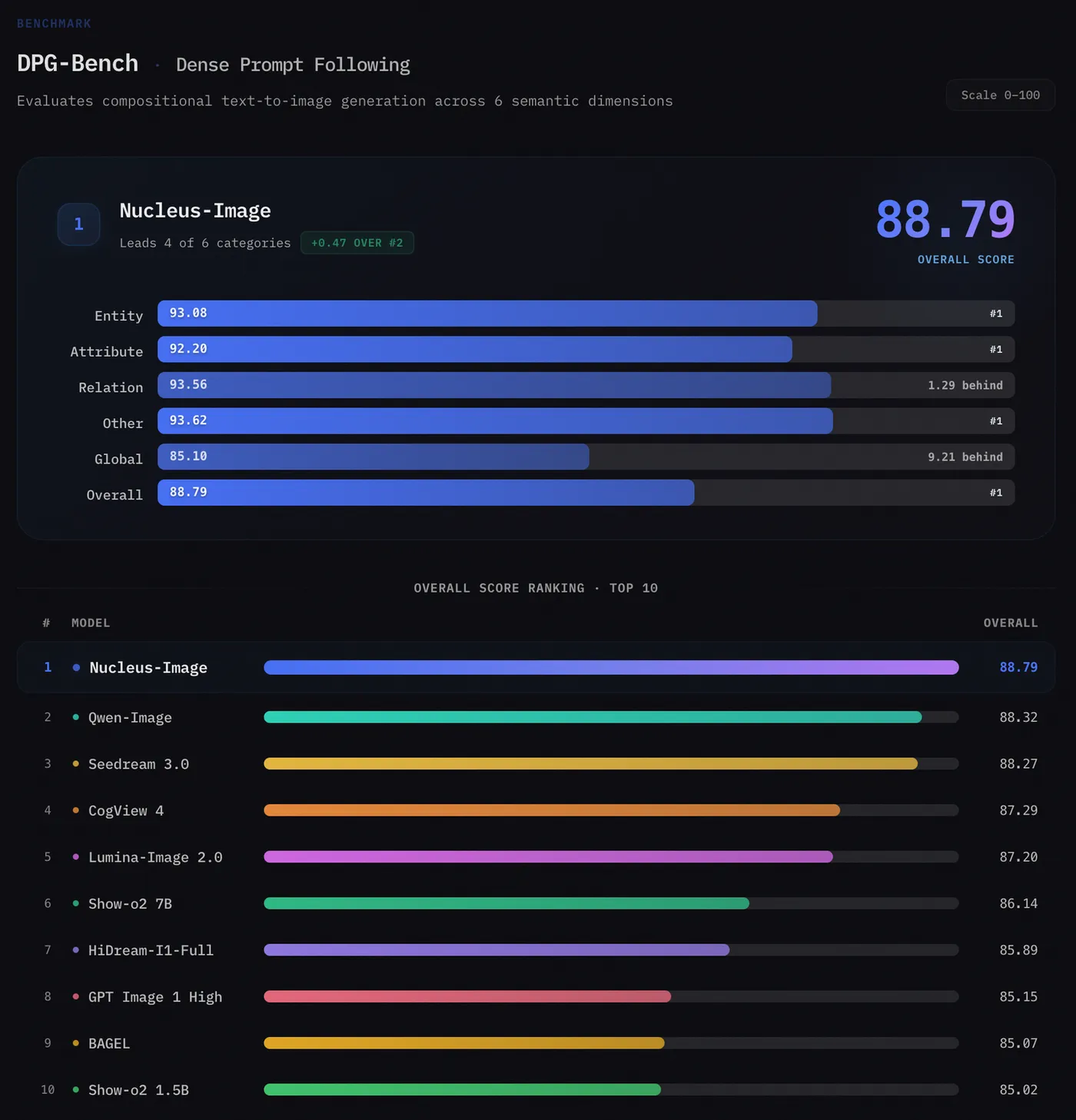 DPG-Bench 密集提示遵循基准 总分88.79,排名第一,领先第二名Qwen-Image(88.32)0.47分。在6个维度中拿下4项第一:实体93.08、属性92.20、其他93.62、总分88.79,仅在Relation(93.56,差1.29)和Global(85.10,差9.21)两项上未登顶。