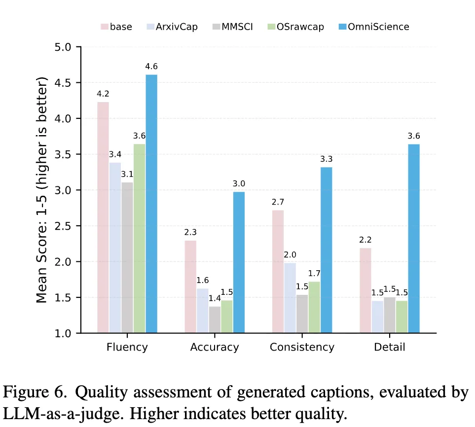 这证明了使用OmniScience数据能够有效增强AI对实验表征图、原理示意图及分析图表的理解能力。此外,通过LLM-as-a-judge方法对训练后的模型进行评估,可以发现:相较于原始模型以及使用MMSCI或ArXivCap数据训练的模型,基于OmniScience数据训练的模型在语言流畅度、准确率、图文一致性以及细节描述等方面均表现出显著优势。验证了 OmniScience 的巨大价值。