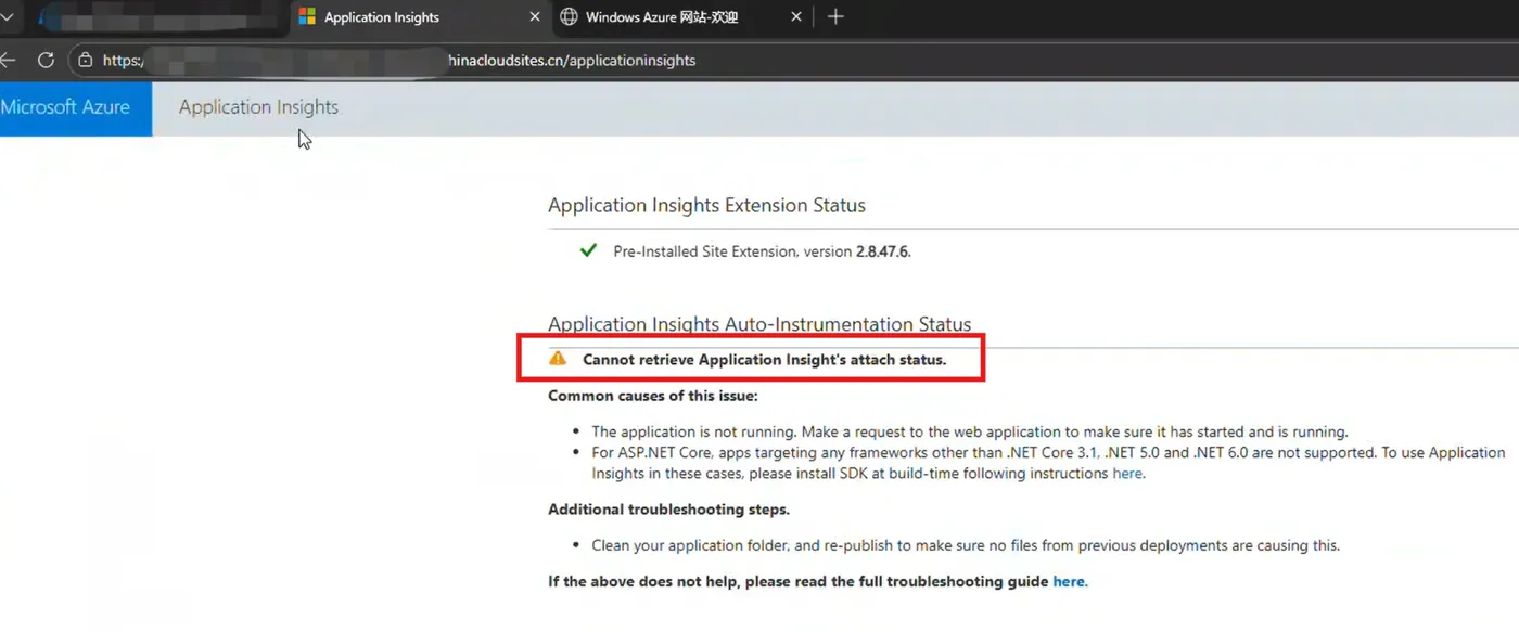 如果第二步中,无法加载Application Insights的dll, 则这个页面会看见报错:Cannot retrieve Application Insight's attach status.