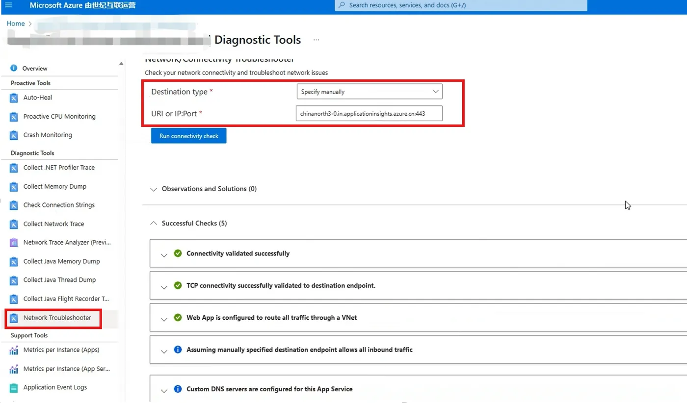 选择Network Troubleshooter工具,在出现的页面中,设置Destination type为 specify manually, URI or IP:Port值则输入:https://chinanorth3-0.in.applicationinsights.azure.cn/v2/track (注:所有中国区Azure的Application Insights都是这个地址)
