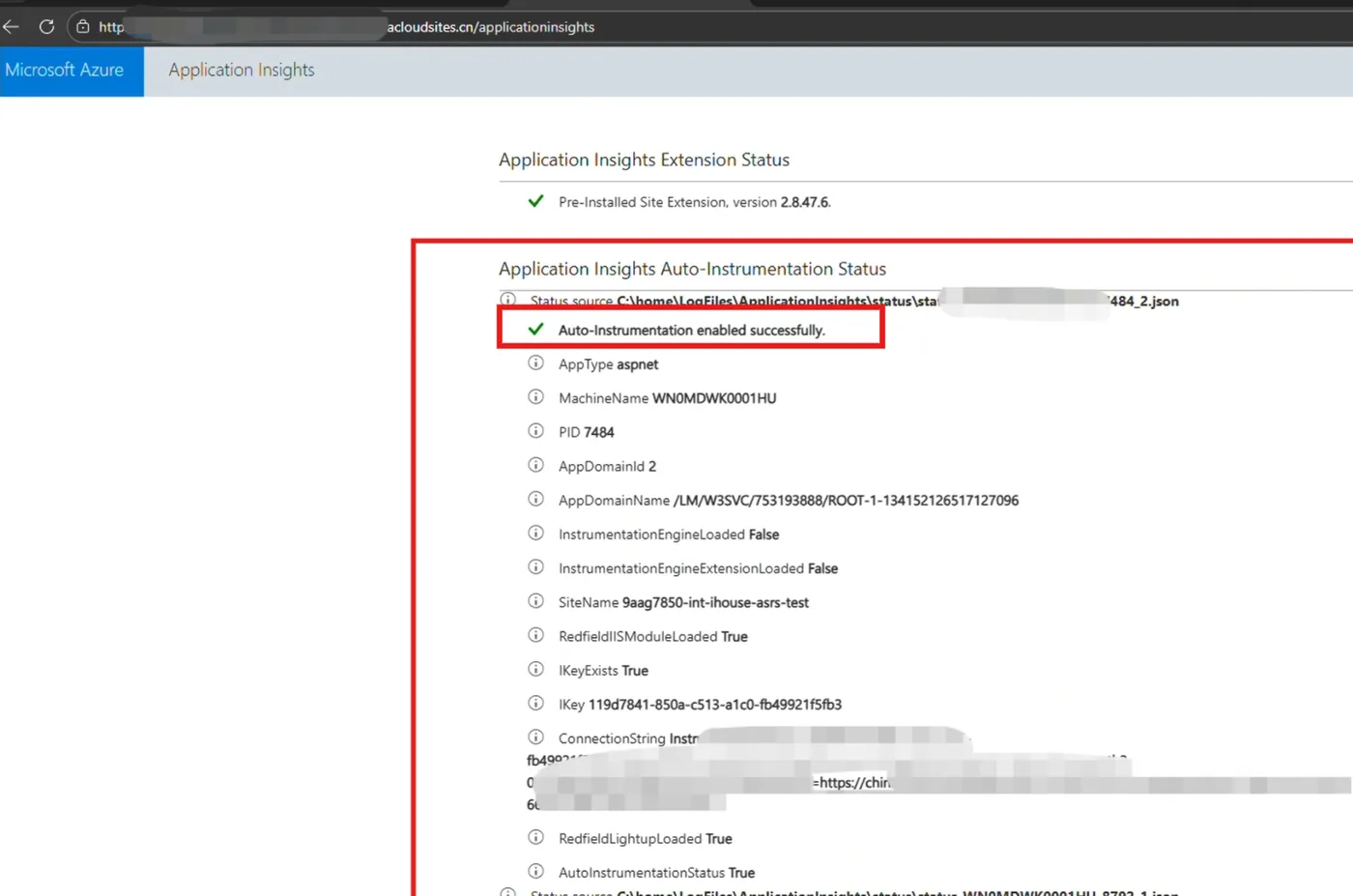 如果第二步中的内容加载成功,则可以查看到Application Insights的状态值: