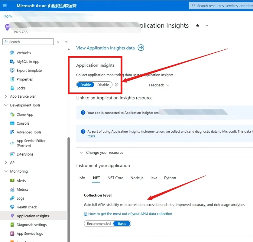 进入App Service中自带的Application Insights状态查看页面(https://<your app service name>.scm.chinacloudsites.cn/ApplicationInsights)