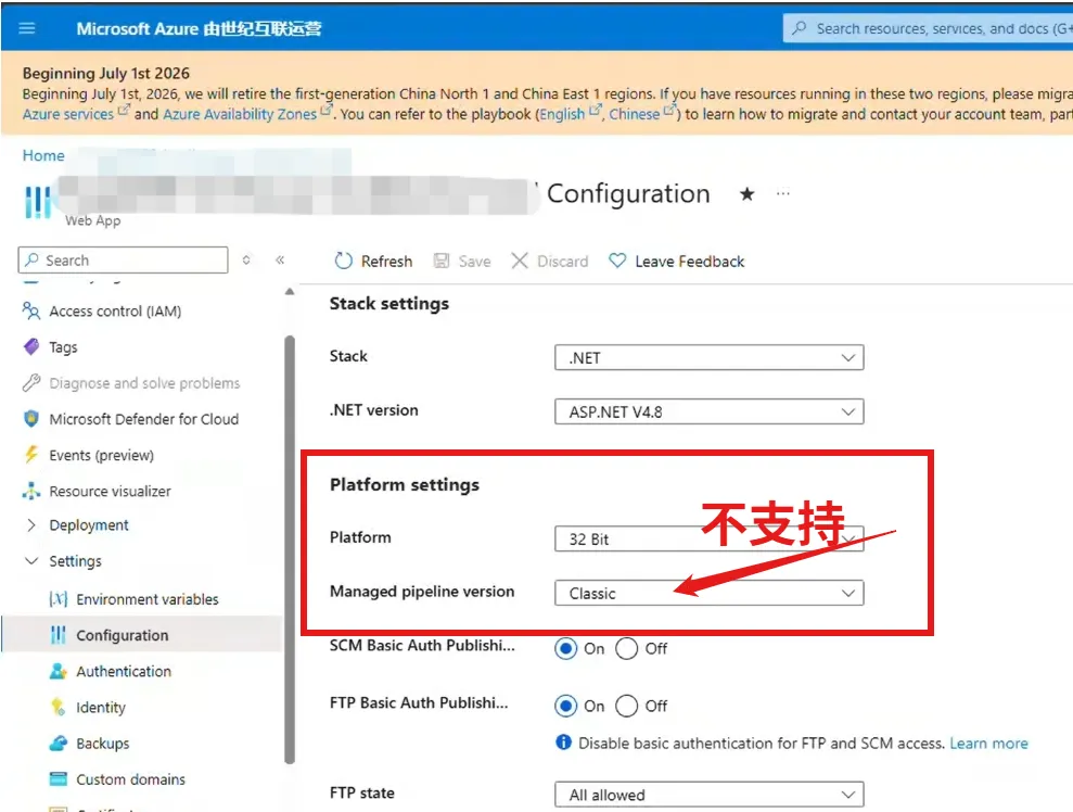在App Service中,可以通过配置页面查看是否设置:
