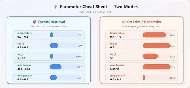 事实性任务在每个维度上都要求收紧约束,创造性任务则反过来全部放开。两者混用——比如拿创造性参数去做财务数据抽取——基本等同于主动邀请幻觉。