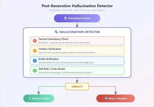 架构再好,也总会有幻觉漏过去。生成后验证层的任务,就是把前面几层没拦住的抓回来。