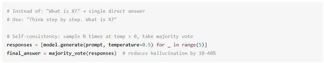 这个方法之所以奏效是因为推理一旦外化,错误就变得可见;自一致性投票里,相互矛盾的推理链会彼此抵消。实验数据显示,开启自一致性能把幻觉率降低 10% 到 40%。