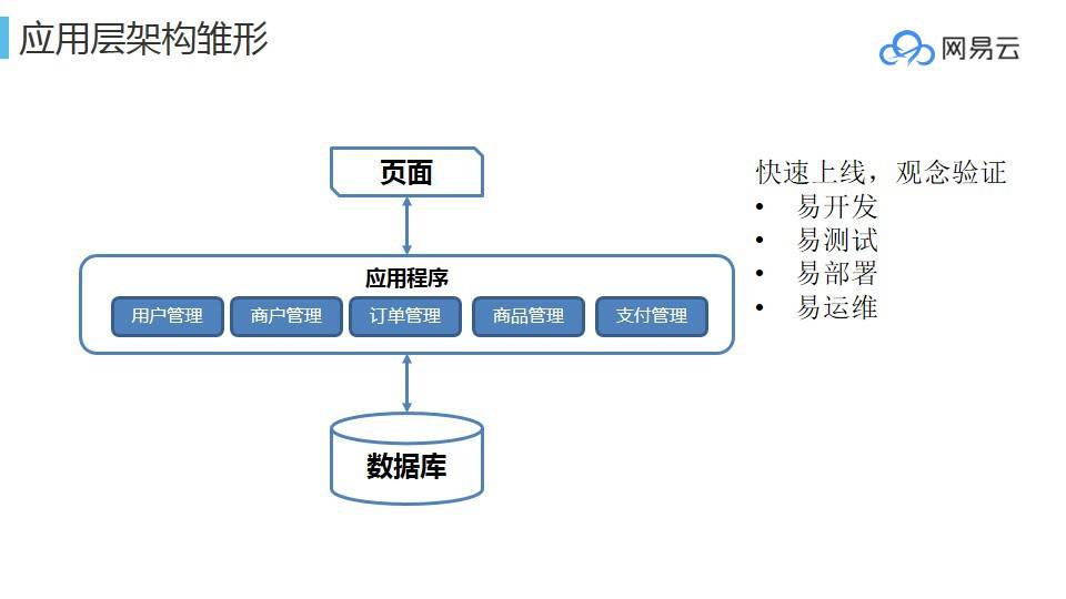 上图就是一个电商系统的雏形,对于一个互联网+的应用,为了系统快速上线,进行观念的验证,多数都会采取集约化的单体架构,主要包括用户管理、商户管理、订单管理、商品管理、支付管理这么几块。这样做的好处是易开发、易测试、易部署、易运维。