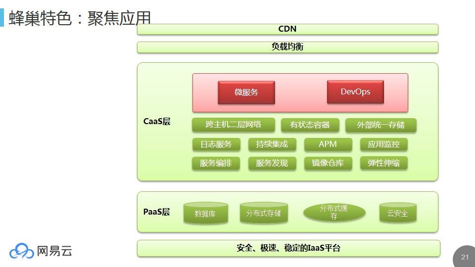 最上层是高可用、高性能的PaaS,蜂巢在这个方面的积累非常深厚: