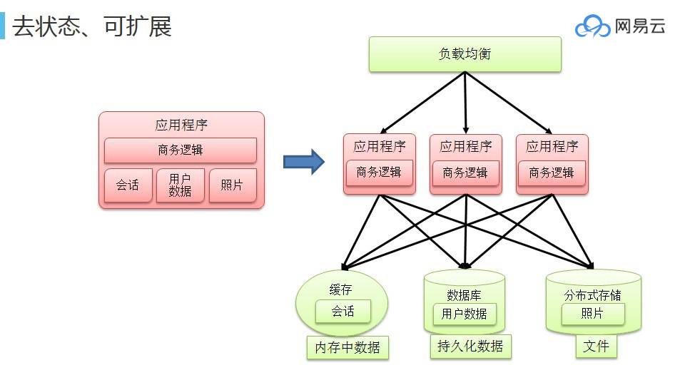 其中有状态的容器只是暂时的方案,还是建议进行应用的无状态化改造,主要就是把内存中的数据保存到缓存中,把用户数据保存到数据库中,把文件保存到分布式存储中。这样应用中只包含商务逻辑,无论怎么扩展都只是商务逻辑的扩展,下面的存储也都有自己的集群,不需要应用层做过多的考虑。